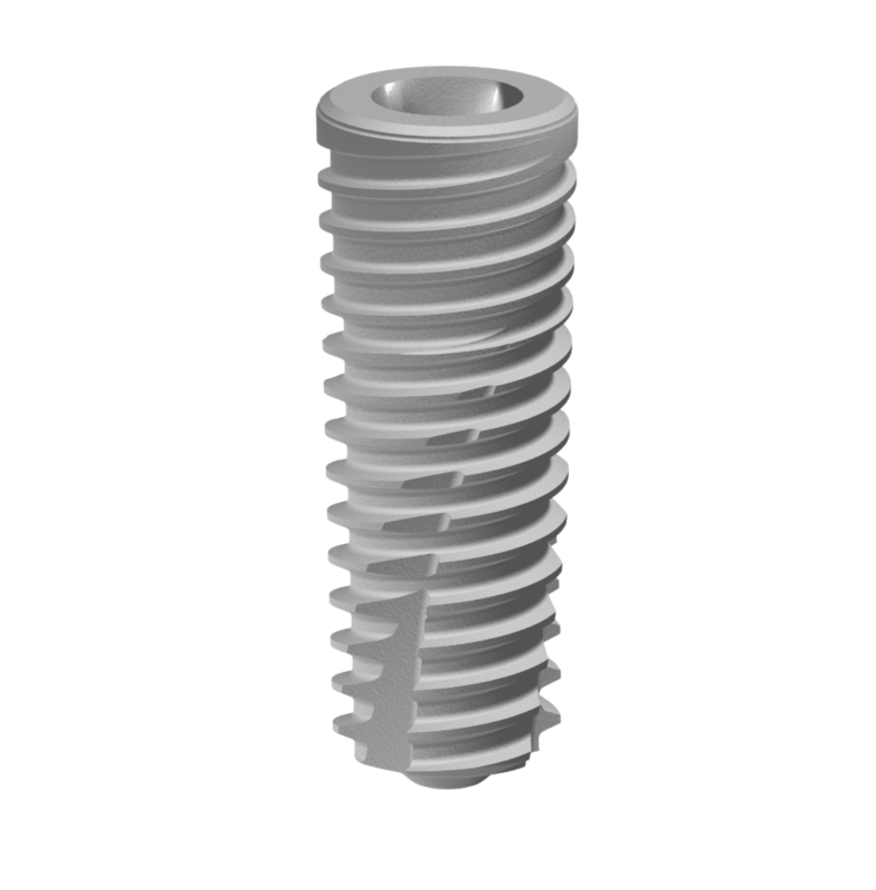 The cylindrical "all-round implant" with its self-tapping thread and rotation-locked internal conical connection.